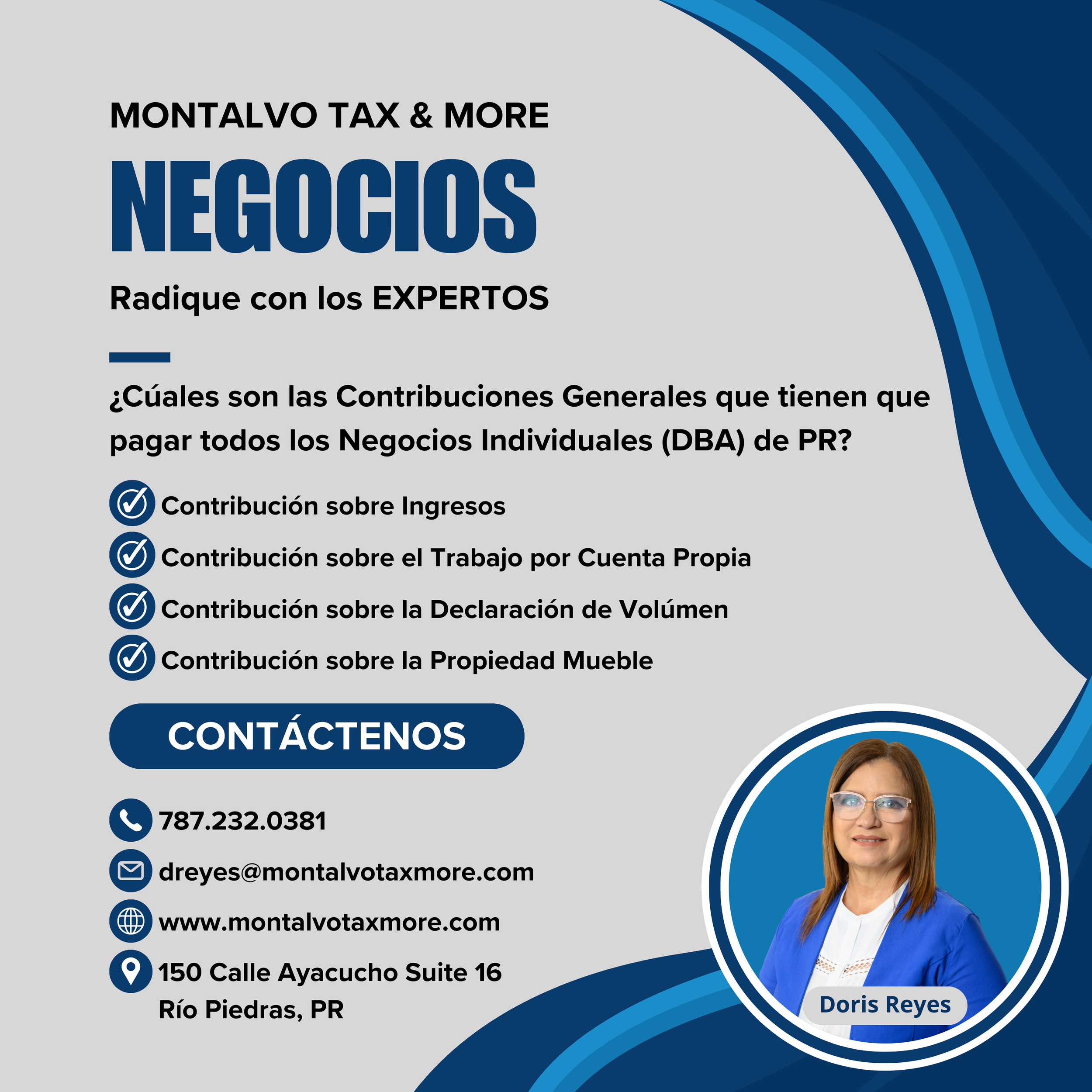 En Montalvo Tax & More nos especializamos en preparación y radicación de planillas requeridas a Individuos y Negocios. Brindamos servicios para asistir en trámites con el Departamento de Hacienda de Puerto Rico, Servicio de Rentas Internas Federal (IRS), Estados de Estados Unidos de América, Municipios de Puerto Rico, CRIM y OGP, entre otras agencias. Nuestros profesionales cuentan con más de 12 años de experiencia en el área de las contribuciones. Brindamos servicios en línea y presencial. Contáctenos, reciba un servicio preciso y eficiente.